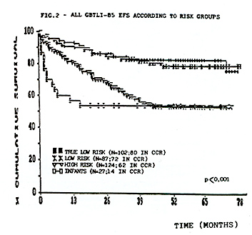 The life table analysis for event free survival EFS representing the evaluation of all adverse events (non-responders, deaths and relapses) for all risk groups, according to each study, is depicted in Figure 1. The projected EFS rates are 50% (SD 5%) after 12 years in study GBTLI-80, 58%(SD 4%) after 10 years in study GBTLI-82, and 70%(SD 4%) after 6.5yr of the GBTLI-85.