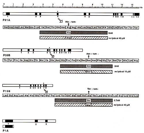Fig.2. Structure of genes P91 A, P35B, P198, and P 1 A