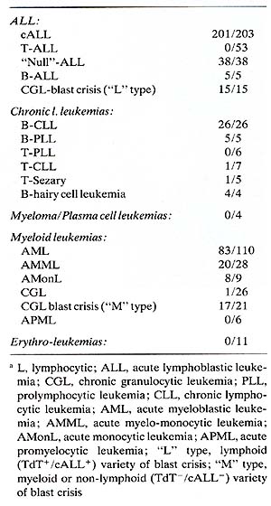 on the majority of cALL and AML (Greaves et a].1981). Of 25 marrows