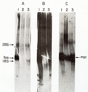 Fig.4A-C. Expression of c-myc and c-fos onc genes in 3LL