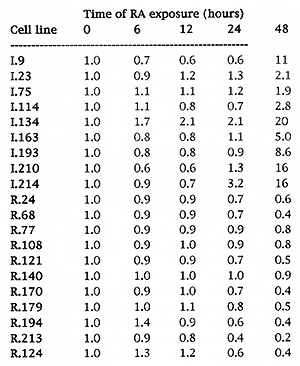 gene is not seen until 26 hours after RA treatment (Vasios et al,