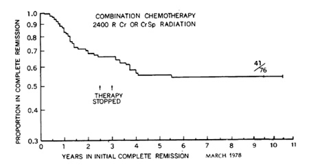 Thank you for the honor of sharing in this memorial to Frederick Stohlman. The work I will report today represents the efforts of many physicians and scientists who have tried to understand and control childhood leukemia. In North America and Europe acute lymphocytic Icukcmia (ALL) represents approximately 80 percent of childhood leukemia and 30 percent of childhood cancer. The disease usually occurs without warning in the well child who has been well cared for. It is characterized by fever, pallor, fatigue, malaise, bone pain, bleeding and enlarged visccra and lymph nodes. Without effective treatment the child soon dies of hemorrhage, injection or tumor encroachment. The diagnosis is made by examination of aspirated bone marrow. In 1948 it was demonstrated that antifolate compounds produced clinical and hematological remissions in some children with ALL [ 10]. However, the remissions were only partial cessation of treatment was followed by relapse in a few weeks, and temporary relapse usually occurred within a few months despite continued administration of the drug. Subsequently , corticosteroids, mercaptopurine, vincristine and occasionally cyclophosphamide were demonstrated to induce remissions of a similar nature [II]. By 1961 it was possible to prolong the lives of children with ALL for a year or more but mortality remained near 100 percent. The major obstacles to cure were: drug resistance, initial and acuired; inadequade distribution of drugs to the leptomeninges resulting in primary meningeal relapse; treatment related hematosuppression, immunosuppression and epithelial damage; and a pessimism about curing leukemia that imprisoned the wills of many physicians [ 15, 18]. The "total therapy" plan of treating ALL initiated in 1962, embodied several innovative features: Combination chemotherapy for induction of remission and continuation treatment; reduction of leukemia cell mass to subclinical levels and restoration of hematopoiesis prior to antimetabolite therapy; meningeal irradiation early in remission to prevent meningeal relapse; cessation of chemotherapy after 2-3 years of continuous complete remission; and most important, a purpose to cure rather than palliate leu kemia (Table I) [15]. Early pilot studies suggested that the plan was feasible and useful [15]. Approximately 9/10ths of the children experienced complete remission, hematological remissions were four times the usual length, and 1/6th of the children remained in complete remission after treatment was stopped. However, the low doses of meningeal irradiation utilized were not effective in preventing meningeal relapse. In a later study the meningeal irradiation was increased and limited to the cranium and upper cervical area, and intrathecal methotrexate was administered during the irradiation period [2]. When followed by five-drug combination chemotherapy for 2 1/2 to 3 years this treatment program resulted in a low frequency of meningeal relapse and 1/2 of the children are now surviving free of leukemia and off treatment for many years [19]. A comparative study proved that moderately high doses of preventive craniospinal meningeal irradiation reduced the risk of initial meningeal relapse 15 fold and again led to one-half of the children surviving free of leukemia when they subsequently received three years of multiple drug chemotherapy [3]. At present meningeal irradiation is the only method demonstrated by long-term comparative study to prevent meningeal relapse both during chemotherapy and after its cessation [3.8,14.19.21]. Most of the children who survive continuously free of leukemia for five years and off treatment for two years are apparently cured. In Fig. 1 the initial continuous complete remission duration of76 children entering complete remission in 1967 to 1970 are plotted on a semilogarithmic graph. All of the children received 2400 rads of cranial irradiation with simultaneous intrathecal methotrexate or 2400 rads of craniospinal irradiation early during complete remission. Subsequently they received multiple drug chemotherapy for 2lh to 3 years or until relapse or death during remission. As indicated. the complete remission duration curve forms a plateau after 4 to 5 years. All children represented in the plateau have been in complete remission for 8 to 10lh years and have been off treatment for 5 to 8 years. Except for the one child who relapsed after 5lh years of complete