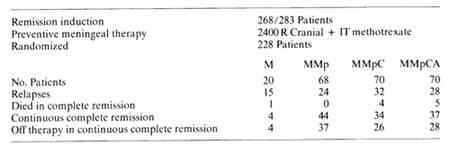 In this comparative study remission was induced with prednisone. vincristine and asparaginase and rollowed by preventive cranial meningeal irradiation with sim ultaneous intrathecal methotrexate Patients were assigned at random to one or fuur regimens methotrexatc alonc (M). methotrexate and mcrcaptopurinc (MMp). methotrexate. mercaptopurine and cyclophosphamide (MMpC). or methotrexate. mercaptopurine. cyclophosphamide and arabinosyl cytosine (MMpCA) The results indicate superior efficacy for the MMp combination