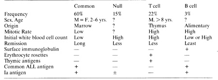 This tentative classification of ALL is based on immunological cell surface: markers of the leukemic lymphoblasts For valid determination of species. Ieukemic Iymphoblasts of the bone marrow need to be studied prior to chemotherapy The table was prepared by Dr. Luis Borella.