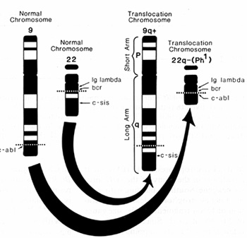 and 22q- (Phi) chromosomes. One protooncogene. ABL, is moved to