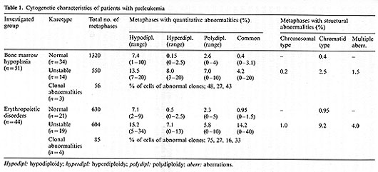 The successes in studying the karyotype of malignant tumors as well as the achievements in molecular biology and molecular genetics have considerably deepened our knowledge concerning the role of chromosomal disorders in oncogenesis [1-4]. Recognition of clonal origin of leukemias [ 5] has stimulated the interest in studying the formation and development of cytogenetically marked leukemic clones during development of leukemias. The purpose of this investigation was to analyze the pathogenetical and clinical significance of karyotypic peculiarities in different stages of the leukemic process. Chromosomal analysis emplyoing the G-banding technique was carried out in 394 patients with preleukemia (PL), secondary leukemia, different stages of chronic myeloid leukemia (CML), and different variants of leukemia (AL). The group with PL consisted of 95 patients with firm cytopenia and either hypo-, normo- or hypercellular bone marrow with erythropoietic disorders. Cytogenetic examinations revealed only normal diploid metaphases, but increased percentages of aneuploid and polyploid cells and structural aberrations, i.e., instability of the karyotype and clonal anomalies. Karyotypic instability manifested both in quantitative and structural aberrations. Quantitative disorders were common for patients with bone marrow hypoplasia, whereas structural aberrations were more often observed during erythropoietic disorders (Table 1). Both chromosomal and chromatid types of aberrations were found, including breaks, fragments, deletions, chromatid exchanges, marked chromosomes, and, sometimes plural aberrations. We observed transformation into acute leukemia in 13 out of 88 patients ( 14.8% ). It was found that in patients with karyotypic instability, the frequency of subsequent emergence of abnormal clones and leukemic processes is reliably higher (36.4% ) than in patients with normal karyotype ( 1.8% ). These data suggest that karyotypic instability may provide a favorable background, or even be the first step, for the formation of leukemic clones. The dis- . covery of abnormal clones may be interpreted as evidence of the leukemic process, even without clinical manifestations. During tumor progression, we observed an increase in the percentage of abnorma] clones cells as well as the appearance of new clones. The majority of patients with leukemia that developed after preceding preleukemic disorders had clonal abnormalities.